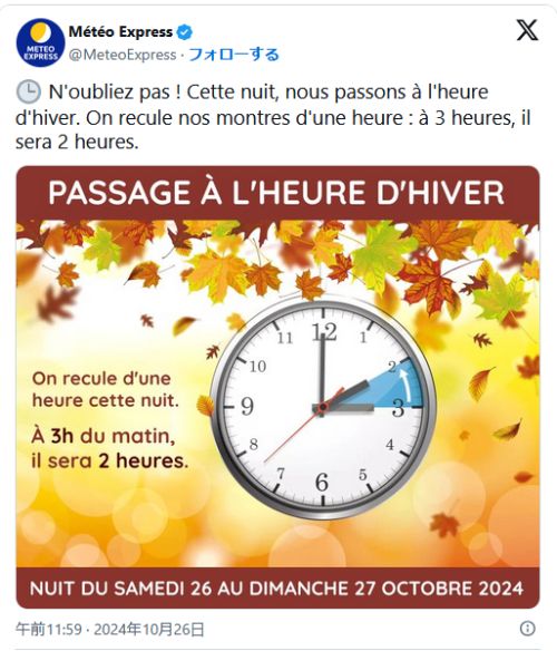 【冬時間】【フランス】【Passage a l'heure d'hiver】日曜日(10月26日)から